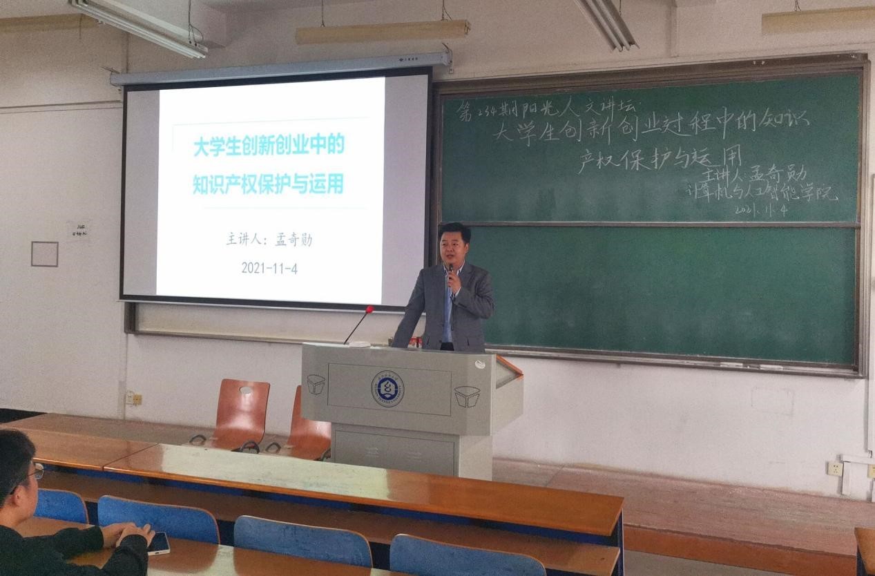 11月4日,由校团委主办、开云kaiyun体育官方网站承办的第234期阳光人文讲坛——大学生创新创业过程中的知识产权保护与运用在崇志楼516如期举行。本次讲坛邀请了武汉理工大学法学与人文社会学院副教授、专硕中心副主任孟奇勋,为同学们讲解大学生创新创业过程中知识产权的保护与运用,学院党委副书记涂耀威出席了本次讲坛。