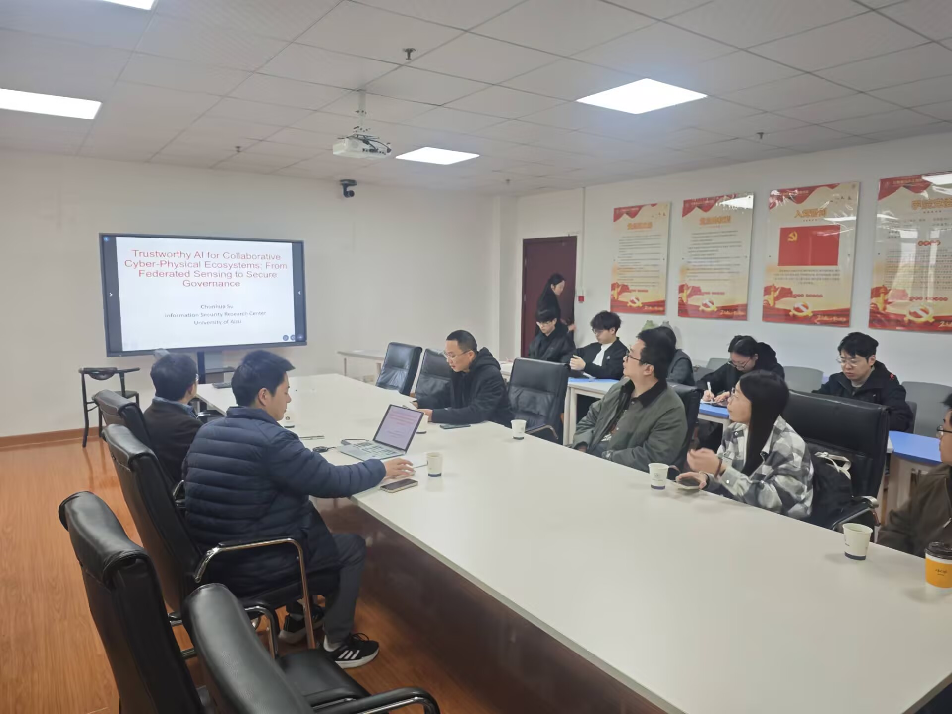 沙龙上,三位专家围绕网络安全与隐私保护技术作了精彩报告。日本会津大学苏春华教授作题为“AI-aided Security for Cyber-Physical Systems”的报告,系统介绍了人工智能辅助下的信息物理系统安全防护技术及在智慧医疗等领域的应用前景;中北大学赵红博士作“AI-Based Physical Layer Key Generation Mechanism”报告,深入阐述了基于人工智能的物理层密钥生成机制;我院朱飞博士作“Lightweight Privacy-Friendly Aggregation Scheme Against Internal Attacks for Smart Grids”报告,分享了面向智能电网的轻量级隐私友好聚合方案研究成果。