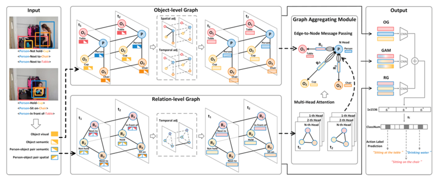 欧阳君博士的论文,提出的目标关系推理图卷积网络(OR2G)从可解释性的角度对动作进行推理,通过将动作分解为一系列时序的目标和关系,构建目标级别图和关系级别图,分别对时序目标和关系进行推理,并利用图聚合模块将关系图节点信息反向更新回目标图,以增加两个图之间的耦合性。在Action Genome数据集上,相比于传统方法获得了较大的性能提升,促进动作识别任务向基于语义推理的方向发展。