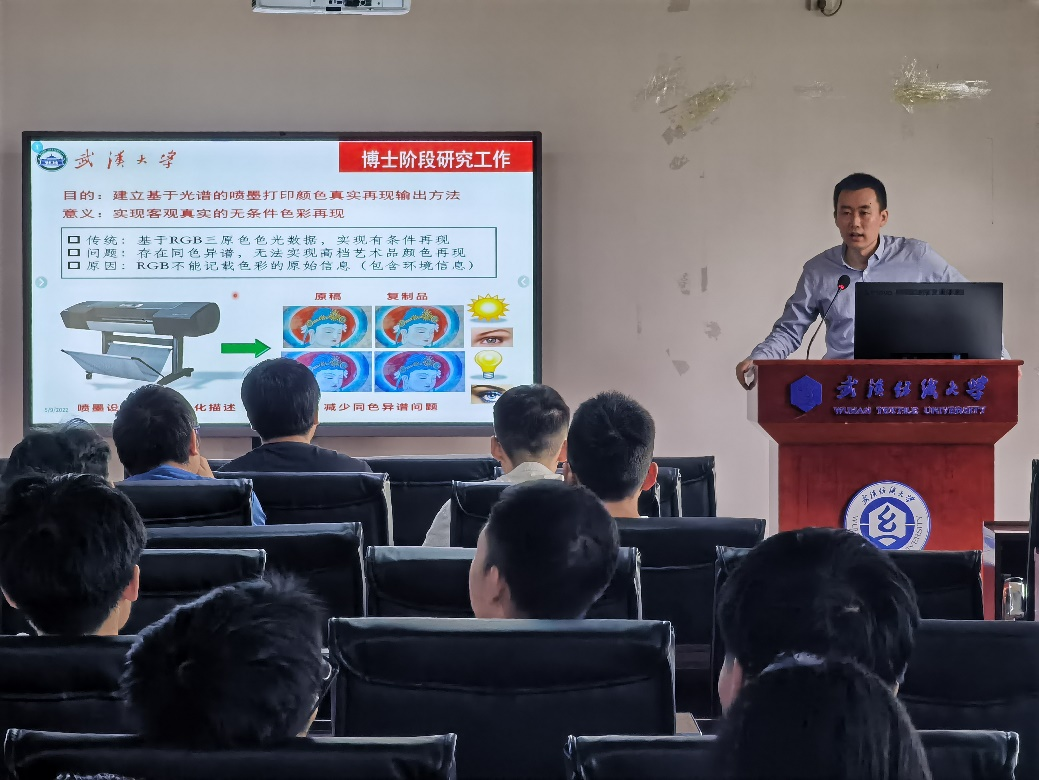 刘强博士系统梳理了从攻读博士开展光谱打印研究课题,到工作之后在照明光品质和颜色视觉研究内容及成果,通过丰富的实验研究案例带领我院师生深入了解光、色和视觉感知的逻辑关系和科学联系,拓展了我院师生在计算机图形处理与颜色科学交叉领域的相关基础知识,并从光品质和服饰照明、纺织面料仿真等方向探讨了纺织、计算机与照明研究的结合点。报告引起了我院师生的强烈反响,刘强博士就我院师生提出的问题一一进行了耐心细致的解答。