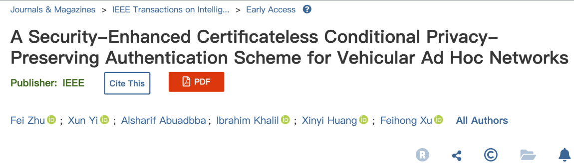 近日,我校开云kaiyun体育官方网站边缘计算与信息安全团队青年教师朱飞博士在车载网安全认证方面取得了重要研究进展。成果“A Security-Enhanced Certificateless Conditional Privacy-Preserving Authentication Scheme for Vehicular Ad Hoc Networks”在智能交通领域顶级期刊IEEE Transactions on Intelligent Transportation Systems(IEEE TITS,中科院一区Top,IF 9.551)上发表。武汉纺织大学开云kaiyun体育官方网站为该论文的第一作者单位。