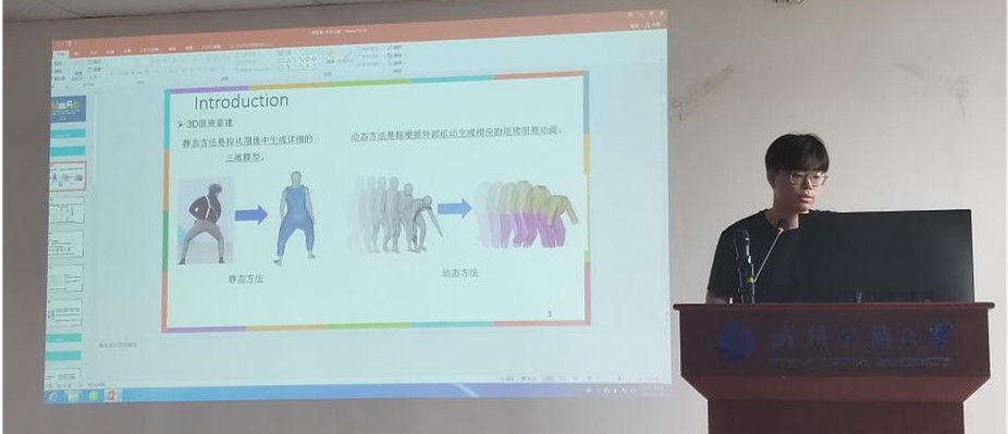 苗佳哲的报告题目是“GVPM: Garment simulation from video based on priori movements”。他简要介绍了目前3D服装动画制作的方法及其不足,为此,他提出了GVPM,它可以从单目视频中学习到可变形的3D服装模型。首先从单目视频帧中恢复姿态网格,提取人体和服装的语义信息,并学习了对视频中的时间相干性进行建模,对恢复的网格施加几何一致性。他提出,先验运动生成模型可缓解视频前后帧之间的过渡不平滑问题,然后训练出一个基于物理的服装模型,这个模型可以准确预测视频中的服装如何根据人体姿势而发生变形的。最后设置出一个时空线索注意力优化模块。该模块可以将动作、关节、形态等联合起来去优化动态服装变形。实验结果显示,该方法能够实现虚拟与现实世界行为相近的3D服装动画仿真。