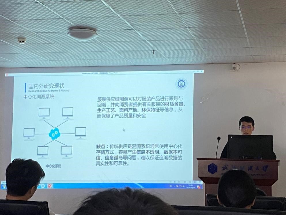 奉钰鑫同学分享主题是“基于区块链的服装供应链溯源模型”,针对服装供应链中,服装溯源数据不透明、难以溯源等问题,结合区块链、IPFS分布式存储和CP-ABE加密技术,提出了一种“链下存储,链上验证”的数据存储和访问控制模型。实验结果表明,该模型可以安全地存储服装溯源数据,降低了链上数据的存储成本,并且满足了服装供应链中各相关利益主体对数据的细粒度访问需求。