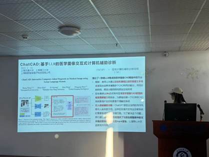 杨珍同学分享的主题是“ChatCAD+: Towards a Universal and Reliable Interactive CAD using LLMs”,她指出大型语言模型(LLM)与垂直领域的的集成在临床应用中具有巨大潜力,特别是在虚拟家庭医生和临床助理的角色中。然而,这一领域的研究目前面临一些困难,特别是在图像应用和提供医疗建议的方面,但这种结合仍有很大的发展空间。此外,LLM和放射科专业医生在写作风格上的不同导致实用性不高。为了应对这些挑战,引入了可靠性强的ChatCAD+,使用LLM通过总结重组自然语言文本格式呈现的信息来增强多个CAD网络的输出,使它能够处理来自不同领域的医学图像。此外,还集成了一个模板检索系统,通过报告模板提高了报告专业性。用这种方法来确保ChatCAD+的输出与人类专业人员的知识更加一致,从而为患者提供更有效、更可靠的诊疗方案。