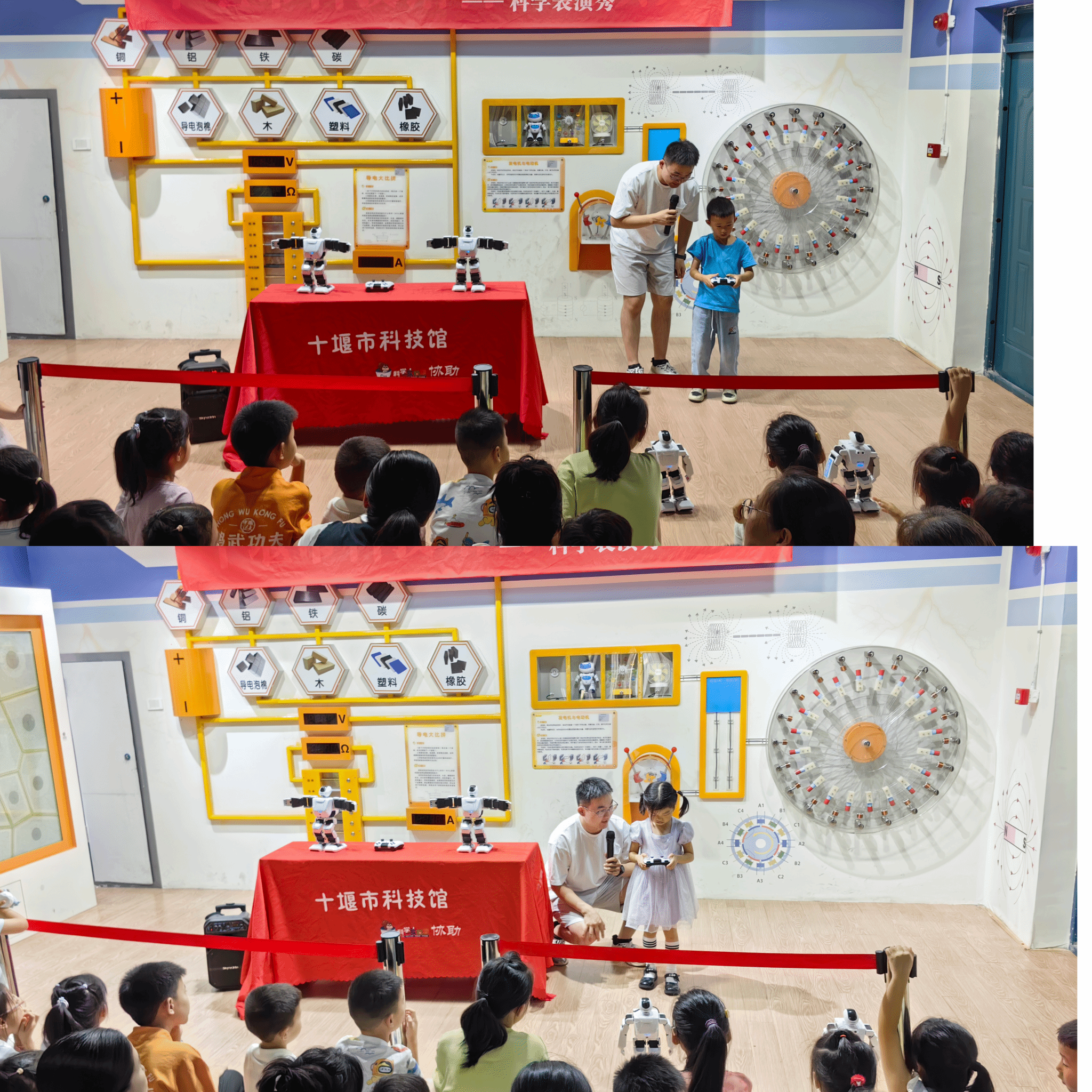 结合十堰市科技馆“每周一秀”品牌活动,实践团带来了四台人形机器人。机器人随着《江南 style》的节奏灵动起舞,孩子们看得十分兴奋,现场气氛热烈。表演过程中,实践团将学校特色与科技元素深度融合。当武汉纺织大学校歌旋律响起,机器人通过精准的程序控制,机械臂随着音乐节奏变换出多样造型,同时,机器人按照编程指令,准确抓取、搬运物品,展示了人工智能的精确性。