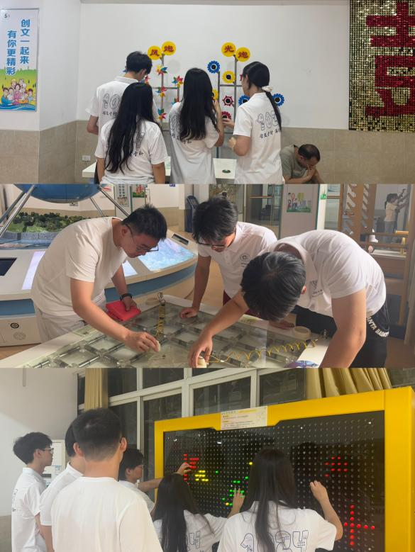 在 “儿童科技乐园” 展厅感受寓教于乐的启蒙氛围后,实践团驻足于 “闪亮的原点” 声光电装置前。成员们通过协作拼接字母模块,成功在展品上呈现 “WTU1024” 字样。实践团成员吴供壕沉浸式体验声悬浮;杨秦体验磁悬浮;王天立摸高跳来;刘襄郧体会“鼓的力量”空气振动;刘聪尝试利用偏振片装置,来吸引铁球移动。这些融合理论与实践的互动体验,不仅让成员们直观理解了科学原理,更通过展品背后的科技故事,触摸到科学家精神中 “爱国奉献、协作创新” 的深刻内涵。