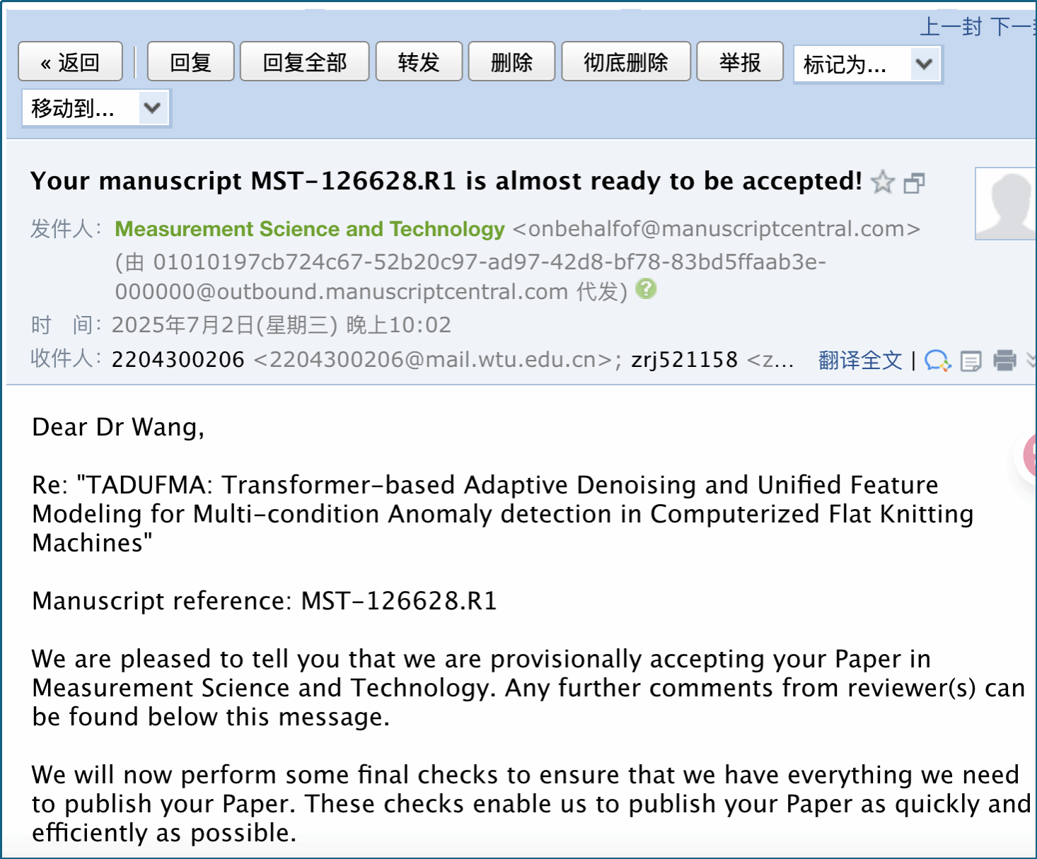 图为论文接收邮件