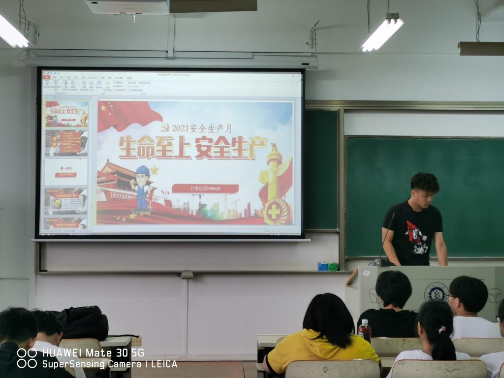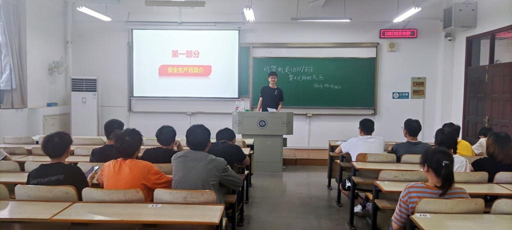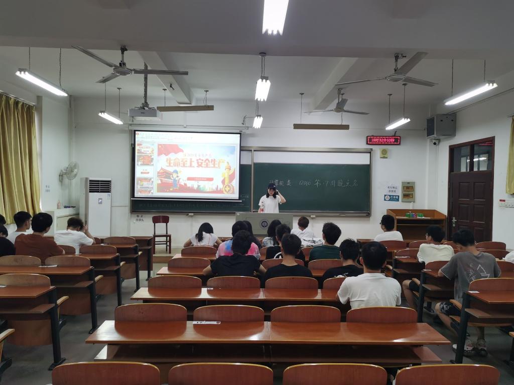 会上,辅导员许超带领大家认识校园安全隐患,其中包括用电安全,盗窃,防骗,交通安全等,介绍了什么是“安全生产月”,要做到落实安全责任,推动安全发展,希望全体学生通过此次班会掌握安全知识,培养“珍爱生命,安全第一”的思想。在大会中,还讲述了我国安全生产管理的方阵,“安全第一,预防为主”,“安全是生产经营活动的基本条件”。