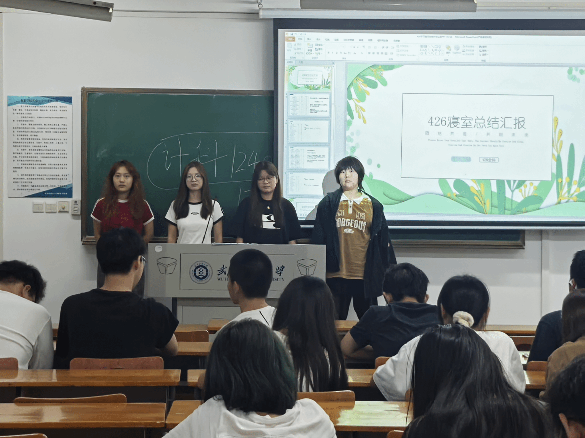 会议伊始,学习委员李炫简要介绍了总结会的目的与流程,强调通过回顾过往、交流经验,为班级新学期的整体进步奠定基础。随后,各寝室代表依次上台,结合PPT展示,围绕学习情况、生活管理、活动参与及未来计划等方面进行分享。