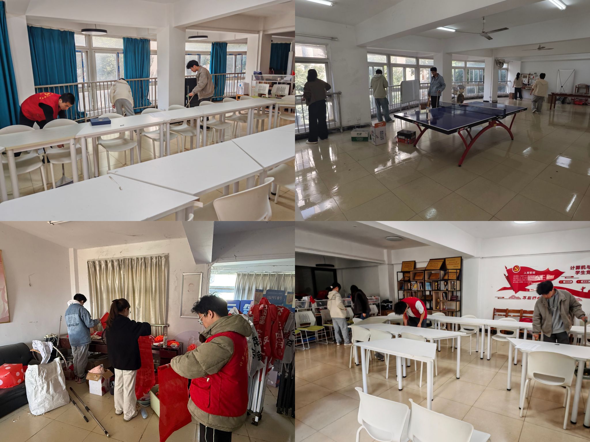 清扫现场,志愿者们分工协作、默契配合,充分发扬不怕脏、不怕累、不怕苦的志愿服务精神,让青春的身影成为校园里一道亮丽的风景线。在一站式服务大厅,大家全面清扫、细致擦拭,将门窗玻璃擦得一尘不染,把台面物品摆放得整整齐齐,逐一清理地面杂物;在三楼学生办公室,志愿者们俯身清理角落积尘,认真规整办公区域,细致擦拭桌椅柜面,为老师们打造清爽整洁的办公环境;在六楼活动室,大家仔细清扫地面垃圾,有序整理活动器材,彻底清除卫生死角,让活动空间焕发出全新面貌。