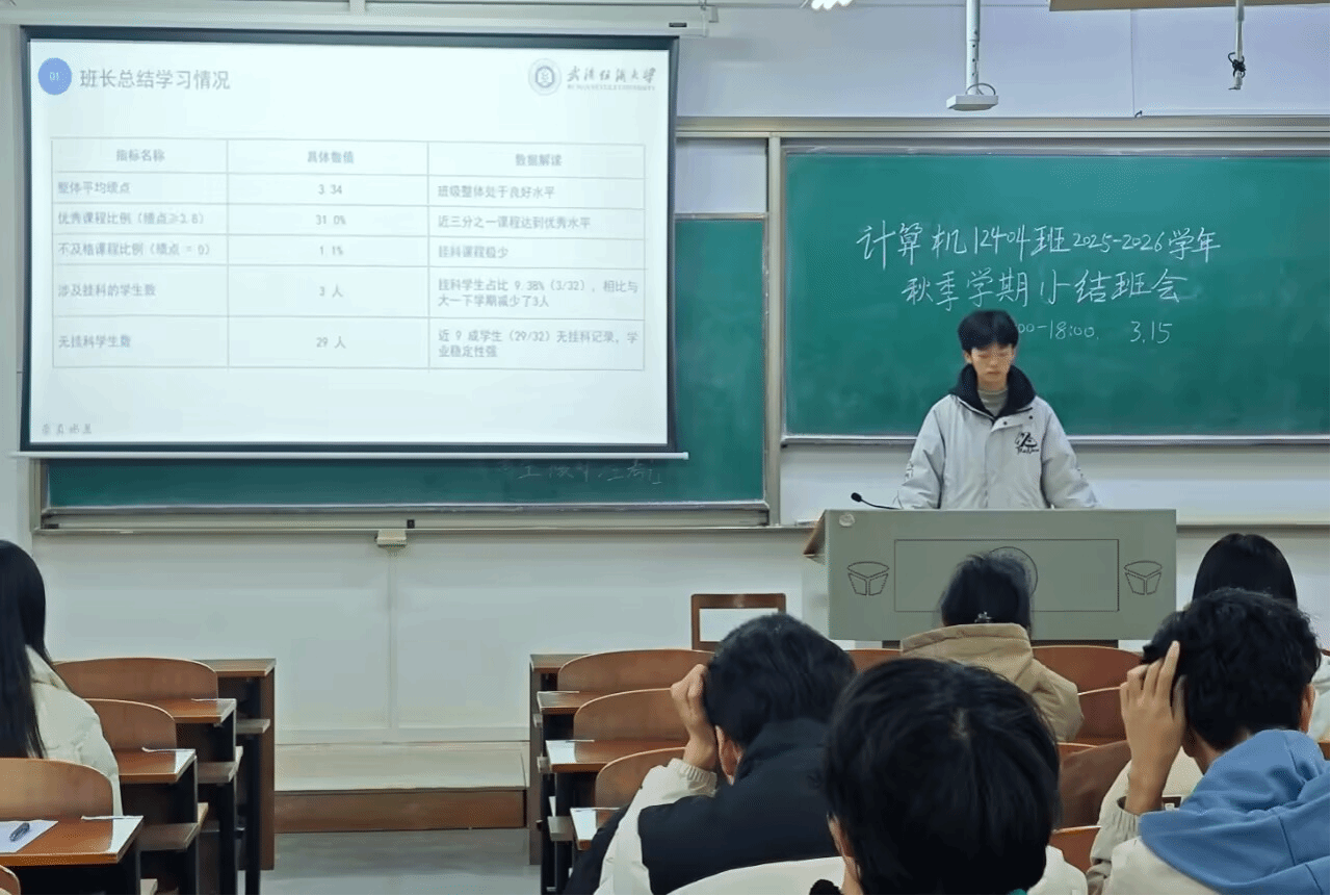 会议伊始,班长毛超强结合详实数据总结班级大二上学期学业情况:上学期班级学业水平实现阶段性跃升,整体绩点、奖学金获奖率、英语考级通过率均创佳绩,学科竞赛参与度与获奖率同步提升,学风建设成效显著;同时客观指出班级存在学业发展不均、部分同学学科基础与实践能力待提升等问题,明确新学期压降挂科率、提升整体绩点、强化竞赛实践、实现全员过四级的核心发展目标,为班级后续发展锚定方向。