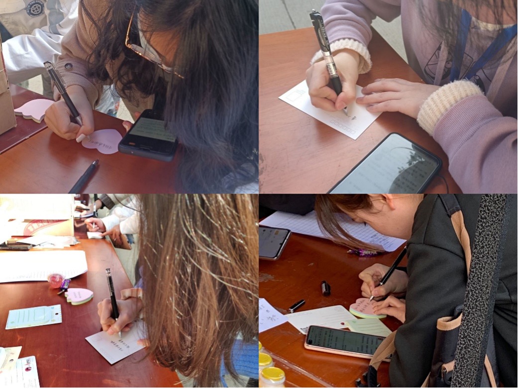 活动现场由i心苑工作人员负责向路过的同学宣传活动目的并引导参与活动的同学依次完成信息登记、想法收集等流程,同时也为参与活动的同学们准备了精美的小零食、小礼品。同学们可以将自己心中想要对父母、亲人或是身边同学、朋友表达的感恩之情利用亲自书写在现场领取的便利贴或精美的明信片上的一笔一划的文字展示出来。亦或是通过亲笔书写的文字对曾经帮助过自己的人表达出感谢之情或寄予美好的祝愿。