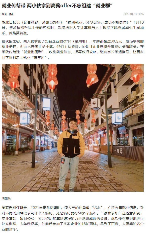 近年来,武汉纺织大学开云kaiyun体育官方网站较好完成学校毕业生去向落实率指标,学生就业薪酬和质量稳居学校前列。《湖北日报》2022年1月11日以《就业传帮带 两小伙拿到高薪offer不忘组建“就业群”》为题,报道了我院学生高薪就业情况。