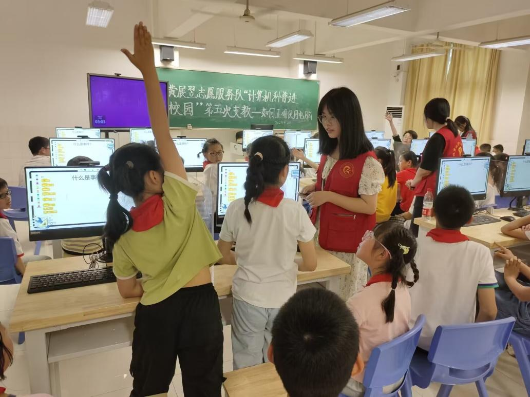 这天,孩子们刚结束激情澎湃的运动会彩排,艳阳下他们带着汗水走进凉爽的机房,迎来他们的第五次计算机科普课。随着教学方法日渐成熟,小老师和孩子们日渐熟悉,这次服务队的教学内容不仅仅是基础的知识,而是更加深入化并对内容适当提高了一些难度。