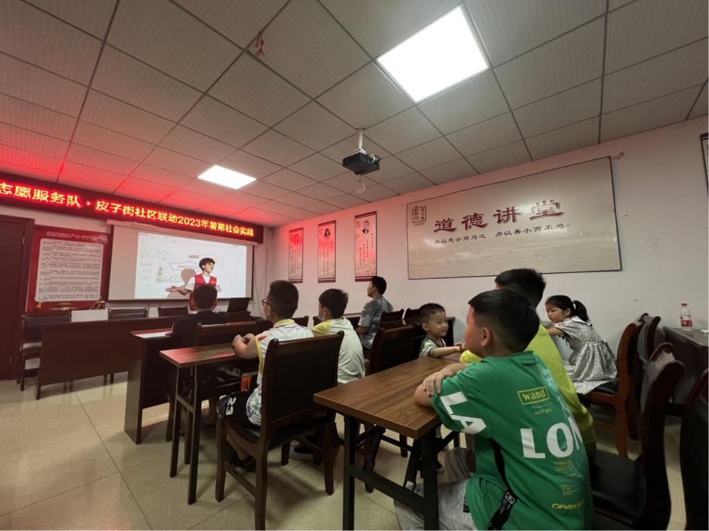 随后黄展翌志愿服务队联动皮子街社区开始了2023年暑期社会实践的第一堂课——安全教育与环境保护。考虑到孩子们年龄差距大,最小的甚至只有三岁半,志愿者们精心准备了安全主题教育课。生动的ppt内容和亲切风趣的话语让孩子们专注力极其集中,每一个小朋友都在积极思考老师的问题并踊跃回答。交通安全和溺水安全是志愿者们强调的重中之重,“大家知道什么是惯性么?”“我知道!我知道!就是因为惯性所以车子刹车的时候会往前冲,就很容易撞伤人,可危险了!”小老师和孩子们互动融洽,小朋友们认真的态度给了志愿者们莫大的责任感与骄傲感。