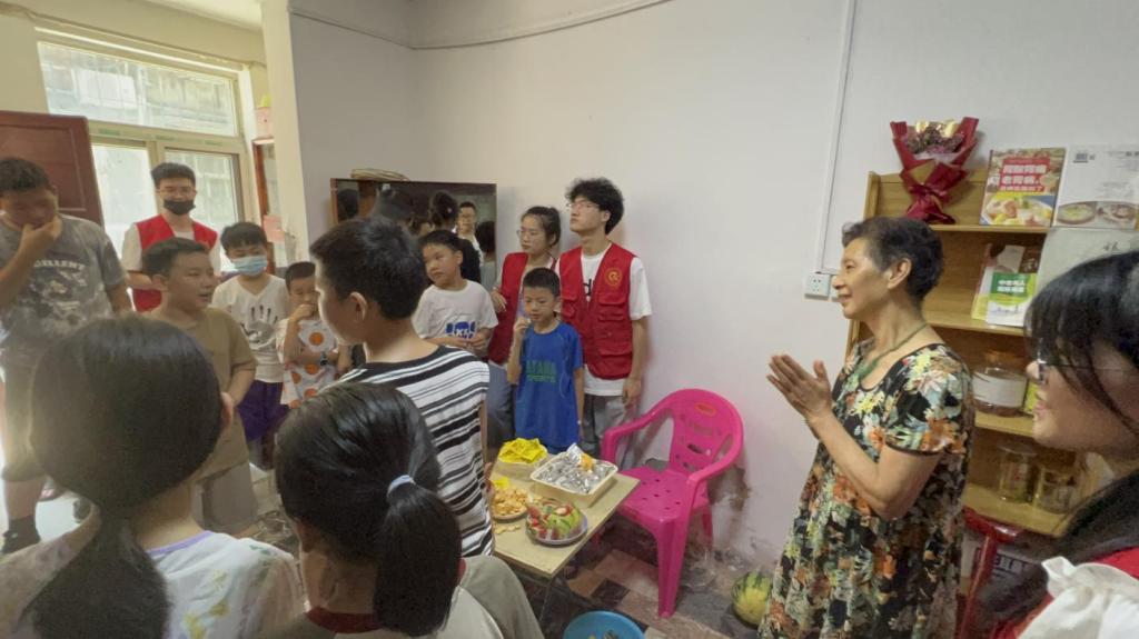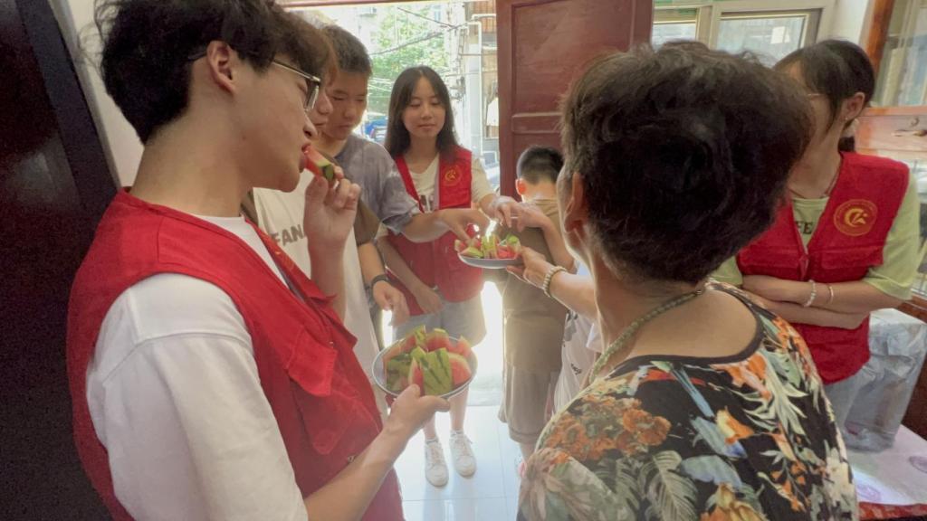 烈日挡不住温情的传递,志愿者们大手牵小手,穿过错综复杂的小巷,带着满脸的汗水来到了王奶奶家。早已准备好西瓜和小零食的王奶奶一看见我们便笑得睁不开眼,招呼着小朋友们吃东西。屋内没有开空调,只是简单的风扇,但是和奶奶开始交谈的那一瞬间,躁动和炎热很神奇地就不复存在了。小朋友们也没有一句抱怨,开心地给王奶奶表演节目,背诵满江红给王奶奶听。王奶奶跟着一起拍手打节奏,那一刻她似乎也变成了无忧无虑的小孩,笑意填满了奶奶脸上岁月的沟壑。