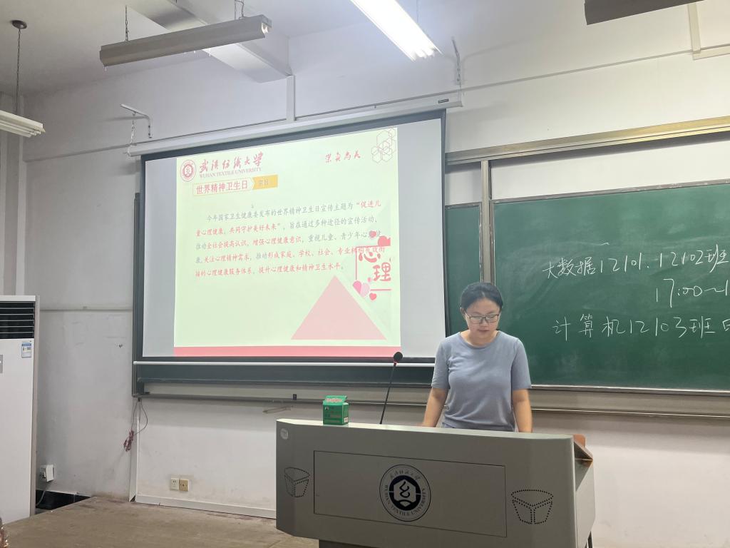 班会伊始,辅导员进行晚点名工作,对还未到场同学逐一进行联系。辅导员在班会上向同学们介绍了世界精神卫生日的由来和发展历程,并介绍学校在下半年即将开展的各类心理活动,鼓励同学们积极参加,利用心理活动舒缓学习生活中的各种压力。
