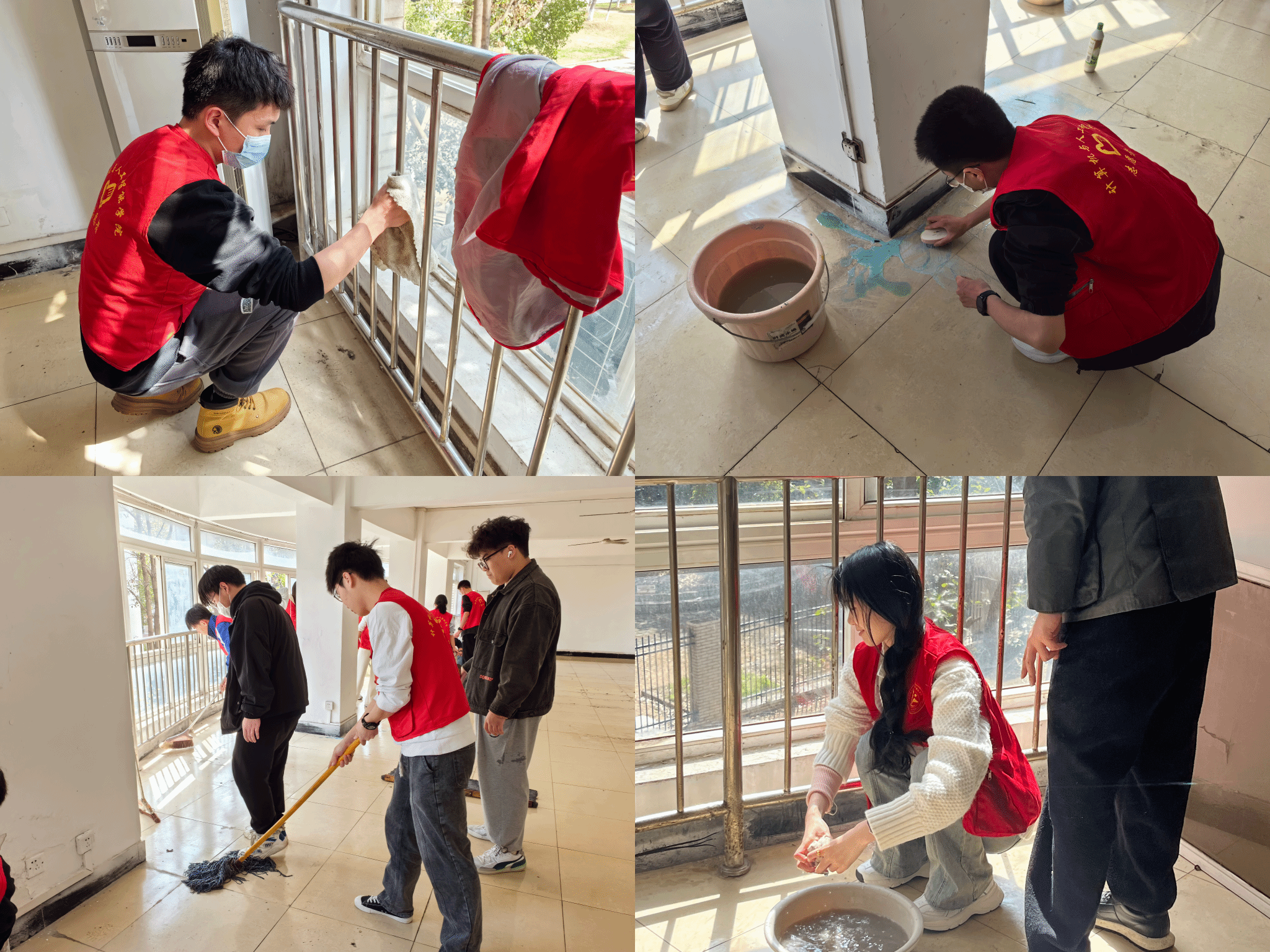 活动中,志愿者们统一身穿红马甲。经过明确分工、细化任务,志愿者们拿着清洁工具,积极投入,有的扫地拖地,有的擦窗户,认真清除地面“牛皮癣”,他们对活动室的边边角角都不放过。经过一上午的打扫清理,三楼活动室焕然一新,他们以实际行动诠释了齐心协力、不怕吃苦不怕累的志愿服务精神。