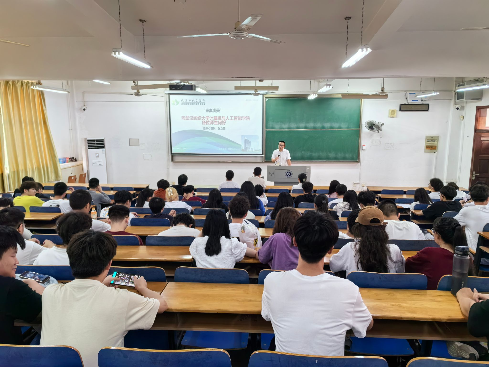 张立国首先引出话题,问同学们健康的标准是什么?张立国通过两个小测试让同学们感受一下自己当前的状态,存在哪些压力等。随后张立国向同学们介绍了武昌医院长期以来对心理帮扶的具体措施,引导同学们正确看待心理问题,积极帮助身边有需要的同学。张立国还为同学们分析了疫情以来大学生出现抑郁、焦虑等情绪的原因,张立国强调情绪与个人的态度是紧密相连的。在生活中,一个有积极乐观态度的人,往往会有更多的积极健康的情绪表现,我们可以通过改变自己的态度来控制自己的情绪。最后张立国介绍了焦虑、抑郁障碍、抑郁症、躁狂、强迫症、精神分裂等症状的具体表现,提醒同学们多加关注有行为异常的同学,及时报告给学校老师们知晓,从而使得自己的同学能得到及时、有效的帮助和治疗。