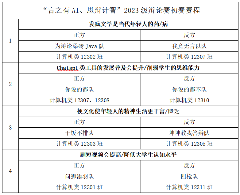 四场辩论中,正反双方引经据典,旁征博引,充分展现了自己的智慧和才华。双方选手从容不迫,机智应对对方辩友的质问,他们精彩的表现将这场辩论赛推向了最高潮。最后,计算机类12302班、计算机类12310班、计算机类12305班、计算机类12301班代表队取得胜利。