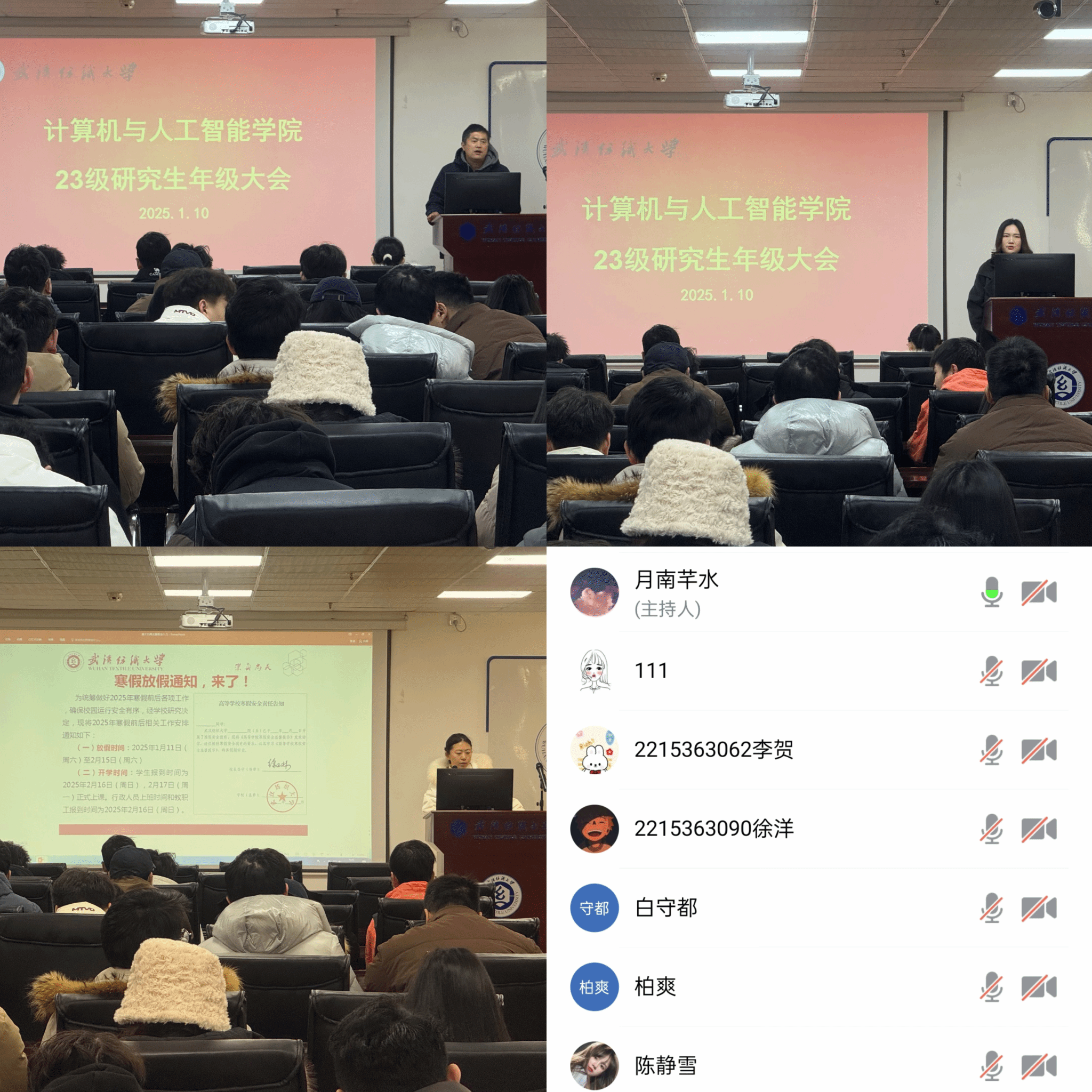 会上魏雄强调,研究生实验室用电安全、座位申请等相关要求,并劝告学生珍惜时间,尽早确定学习目标和就业方向。罗园提醒学生注意毕业条件,尤其是实践学分。余梦帆围绕寒假安全、离校手续等内容展开。