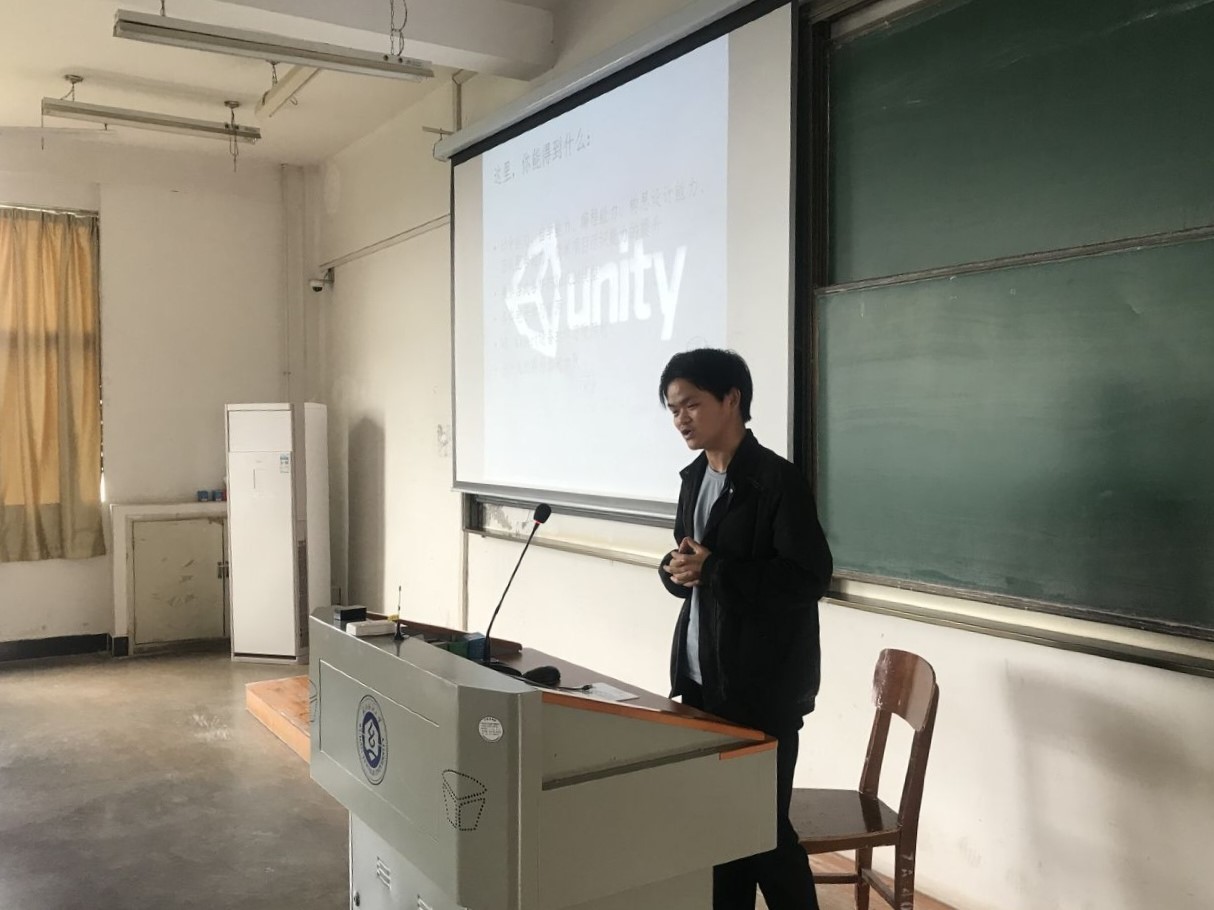 来自计算机学院大一的胡宗旭对3D游戏与虚拟现实开发俱乐部进行介绍。在讲解完加入俱乐部带来的一系列正面影响后,胡宗旭展示了有关unity的各类模型图与众多学习资源,并展示了多款有关VR的体验设备。同时,他向同学们介绍了有关社团的基本活动安排和社员要求,讲解了社团的相关情况。
