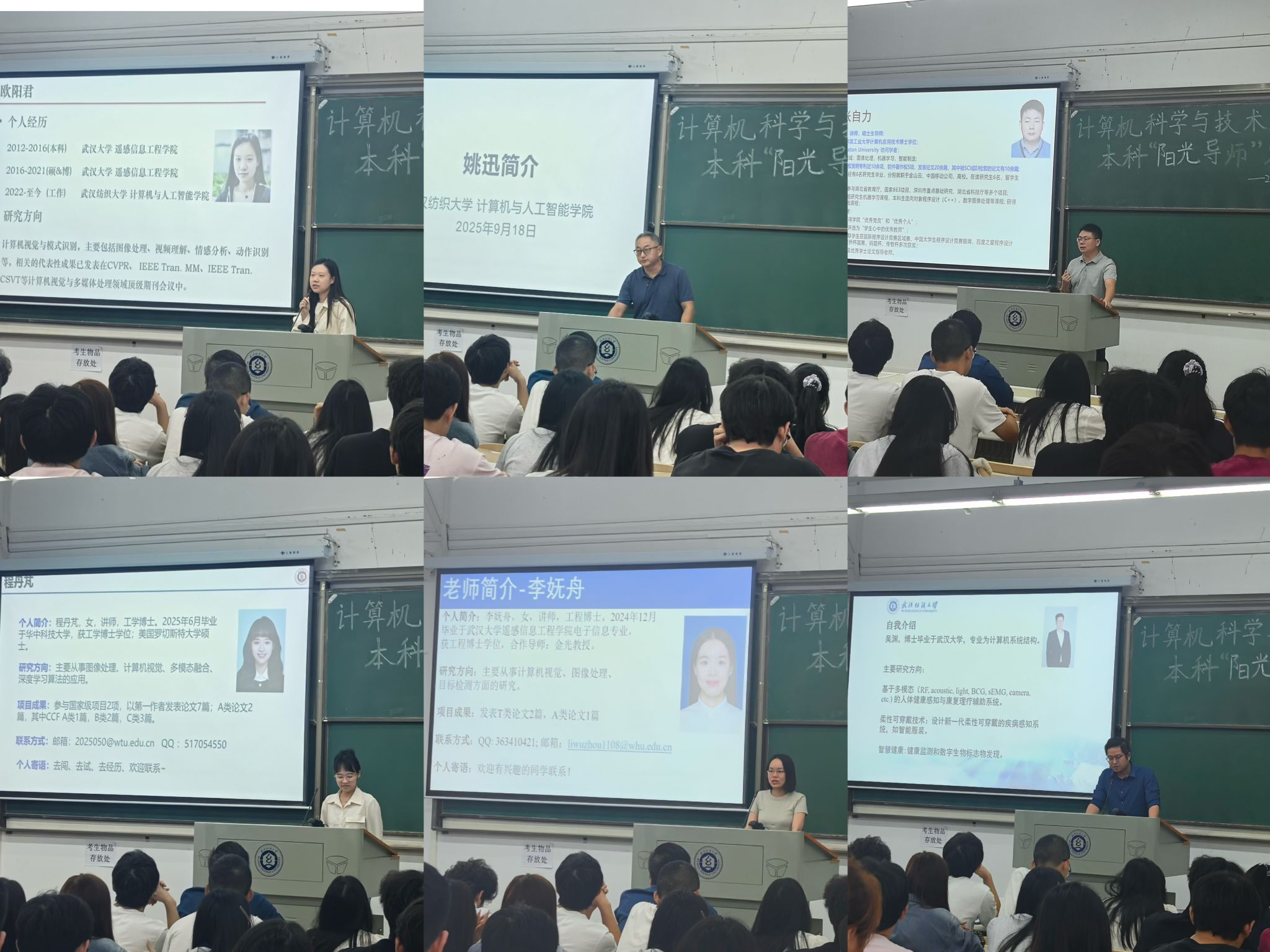在导师介绍环节,到场的阳光导师依次上台发言。刘天鹏老师、欧阳君老师、张自力老师、崔树芹老师、鲁伟军老师、刘莉老师、姚迅老师、程丹芃老师、李妩舟老师、吴渊老师等,分别从个人研究领域、科研成果、团队氛围及对学生的培养要求等方面进行了详细介绍。涵盖了人工智能、计算机视觉、自然语言处理、多媒体信息处理、虚拟现实、网络安全、嵌入式系统、智慧健康等多个研究方向,为同学们提供了丰富多样的选择。