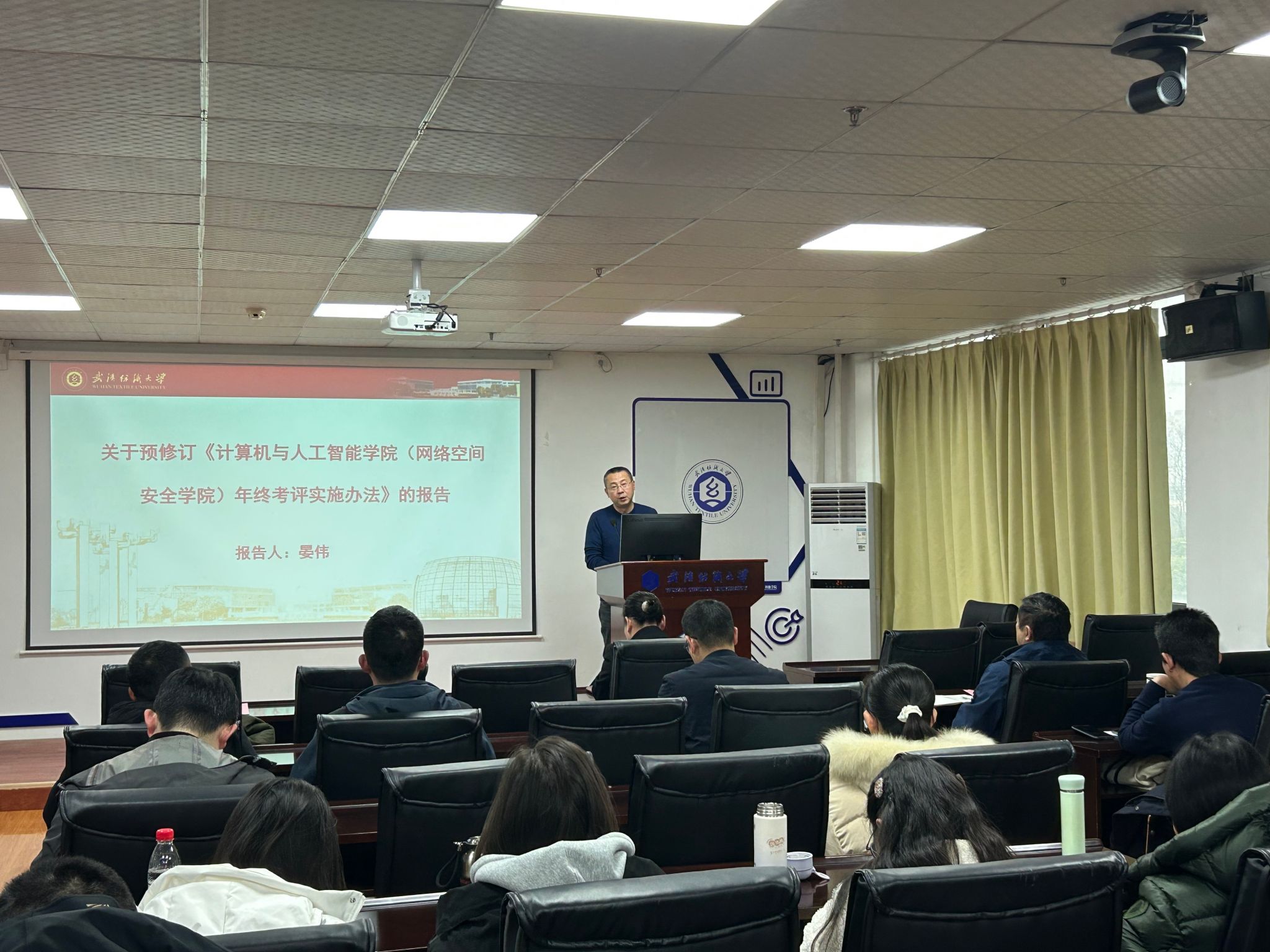 院党委书记晏伟作关于预修订《开云kaiyun体育官方网站(网络空间安全学院)年终考评实施办法》的报告。他详细解释了修订考核办法的背景与核心思路,强调年终考核的核心目的是为了进一步优化学院发展生态,让“学生成长、教师发展、学科融合、社会认可”的发展理念深入人心。通过科学合理的考核导向,充分激发教职工的工作积极性与创新活力,推动学科交叉融合走深走实,全面提升学院的核心竞争力与社会影响力。