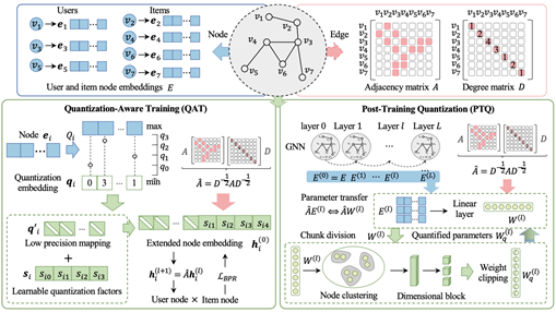 该工作围绕推荐系统资源受限场景,针对现有模型量化方法关注深度神经网络中间层参数,难以充分刻画图结构中节点表示的差异性与复杂拓扑关系,导致低比特条件下性能下降明显的问题,提出了一种面向图协同过滤的分块量化框架(GraphQ。该框架考虑量化感知训练(QAT)与后训练量化(PTQ)两种范式,统一实现训练与推理阶段的优化。在多个真实数据集上的实验结果表明,提出方法在低比特(如2-bit4-bit)设置下,相较于现有量化方法在RecallNDCG等指标上均取得了稳定提升。