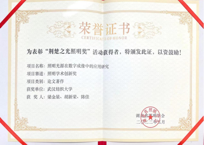 为了调动广大照明科技工作者和企事业单位的积极性、创造性,促进湖北省照明事业的发展,根据《中华人民共和国科学技术进步法》和《国家科学技术奖励条例》的有关规定,湖北省照明学会从2021年起正式设立“荆楚之光”照明奖。该奖项旨在奖励省内外照明领域中,在科学研究、技术创新、成果推广应用、实现高新技术产业化、照明工程实施和科普教育方面做出杰出贡献的企事业单位和个人以及照明项目、照明产品。奖项设置照明科技创新奖、照明工程奖、照明设计奖、照明学术创新奖等四项内容。我院青年教师梁金星、胡新荣教授和陈佳副教授的共同研究成果荣获“照明学术创新奖”。