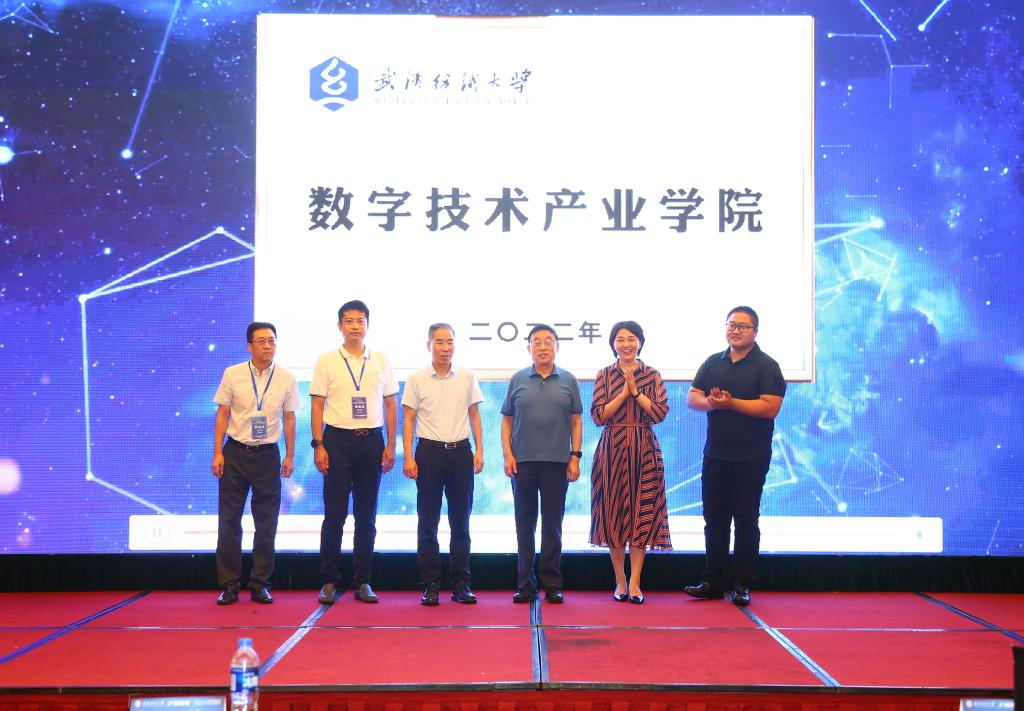 (柴天佑院士、徐卫林院士、武汉纺织大学教务处王济平处长、武汉光庭信息技术股份有限公司李红副总经理、中电金信教育生态业务梁恒总经理、北京易华录人力资源管理中心夏东副总经理为武汉纺织大学“数字技术产业学院”揭牌)