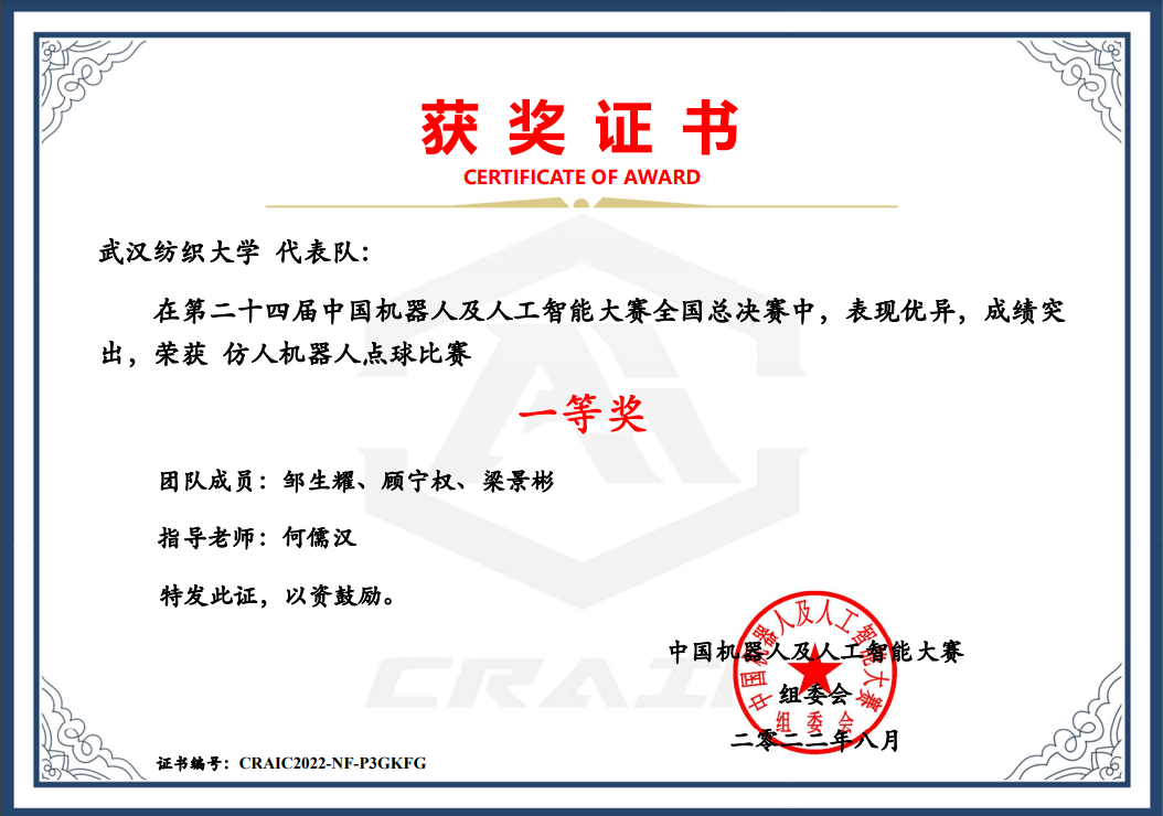 由开云kaiyun体育官方网站何儒汉老师指导的三支代表队:学生邹生耀、顾宁权、梁景彬参加的仿人机器人点球比赛获得全国总决赛一等奖;学生邹生耀、顾宁权、张志众参加的仿人机器人短跑比赛获得全国总决赛一等奖;学生徐东东、唐端、刘书宇参加的单人舞项目获得省级比赛三等奖。