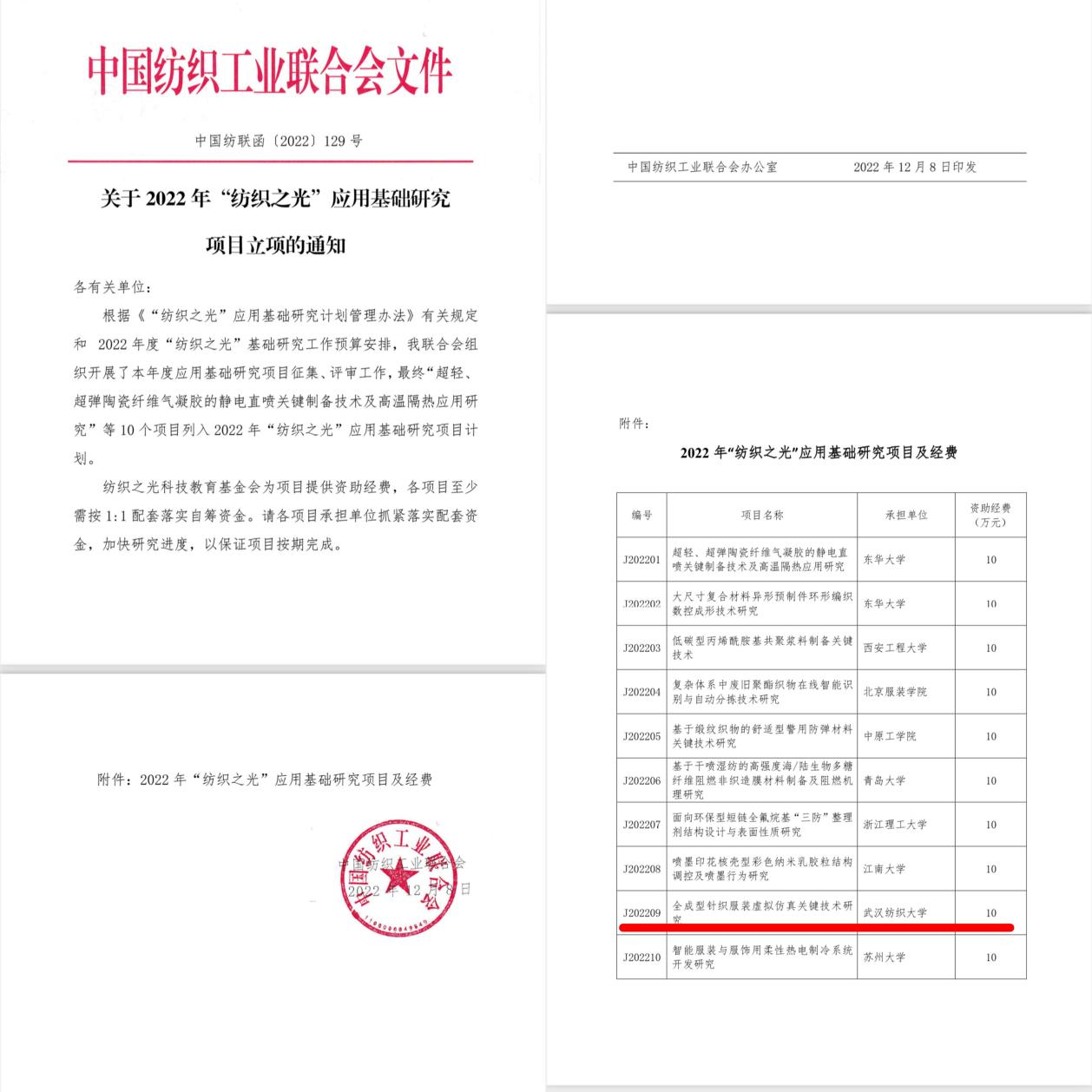 近日,中国纺织工业联合会公布了全国2022年度“纺织之光”应用基础研究立项项目名单,开云kaiyun体育官方网站胡新荣教授主持的“全成型针织服装虚拟仿真关键技术研究”获得资助(全校唯一)。