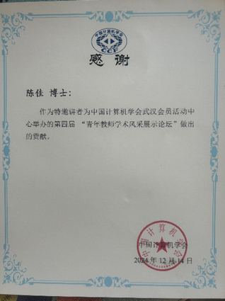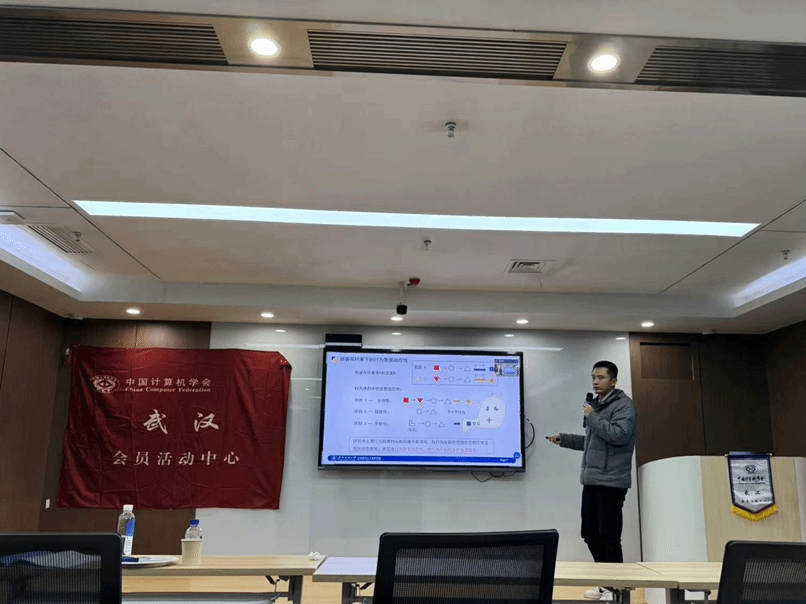 2024年12月14日由CCF武汉会员活动中心(简称:CCF武汉)主办,武汉科技大学承办的CCF武汉第四届青年教师学术风采展示论坛在武汉科技大学黄家湖校区举行。CCF武汉自2012年11月24日成立之日起,始终秉承学会和会员活动中心的使命与愿景,在“家门口”为武汉以及周边地区会员服务。本次主办的青年教师学术风采展示论坛由华中科技大学郑渤龙教授和武汉理工大学袁景凌教授担任主席,汇聚了来自武汉大学、华中科技大学、武汉理工大学、华中师范大学、华中农业大学、中国地质大学(武汉)等6所部属高校和武汉科技大学、武汉纺织大学、湖北工业大学、武汉工程大学等4所省属高校共13名青年教师。论坛上,我院教师陈佳教授和青年博士胡开喜分别报告了AI赋能发展新质生产力的前沿产业应用和顶级期刊会议上的最新研究成果,与各位青年学者展开了积极的讨论。