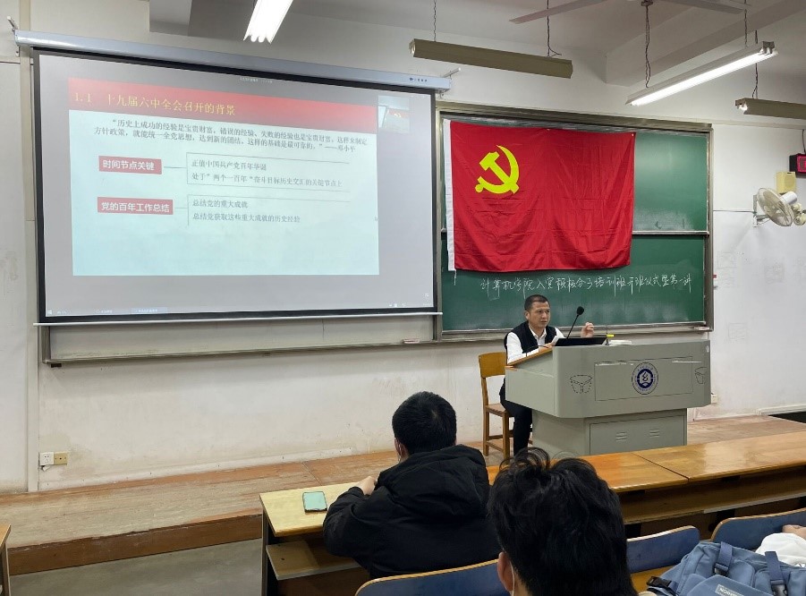 学院党委书记胡红辉围绕中国共产党十九届六中全会展开,重点解读了公告文本内容。