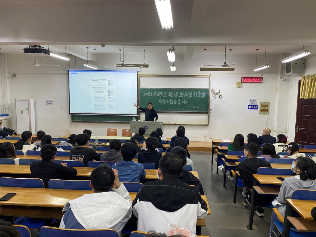 交流分享后,软件工程系主任叶鹏总结发言。他对三位同学的分享表达感谢,同时寄语全体软件工程系学生要不断丰富自身的专业技能与专业素养,呼吁同学们不管是在就业还是升学的路上要有认真踏实的态度、迎难而上的品格、坚持不懈的努力。